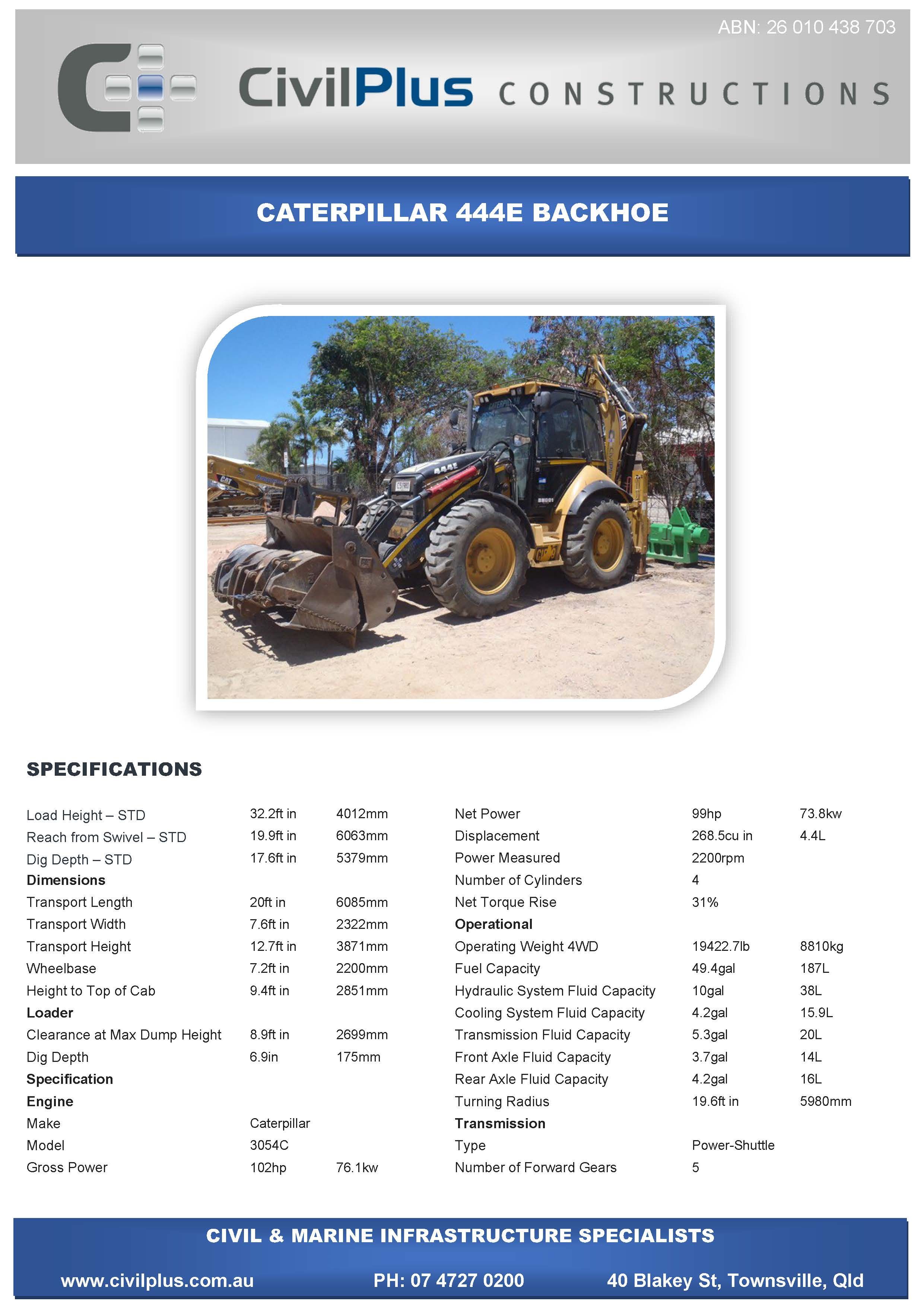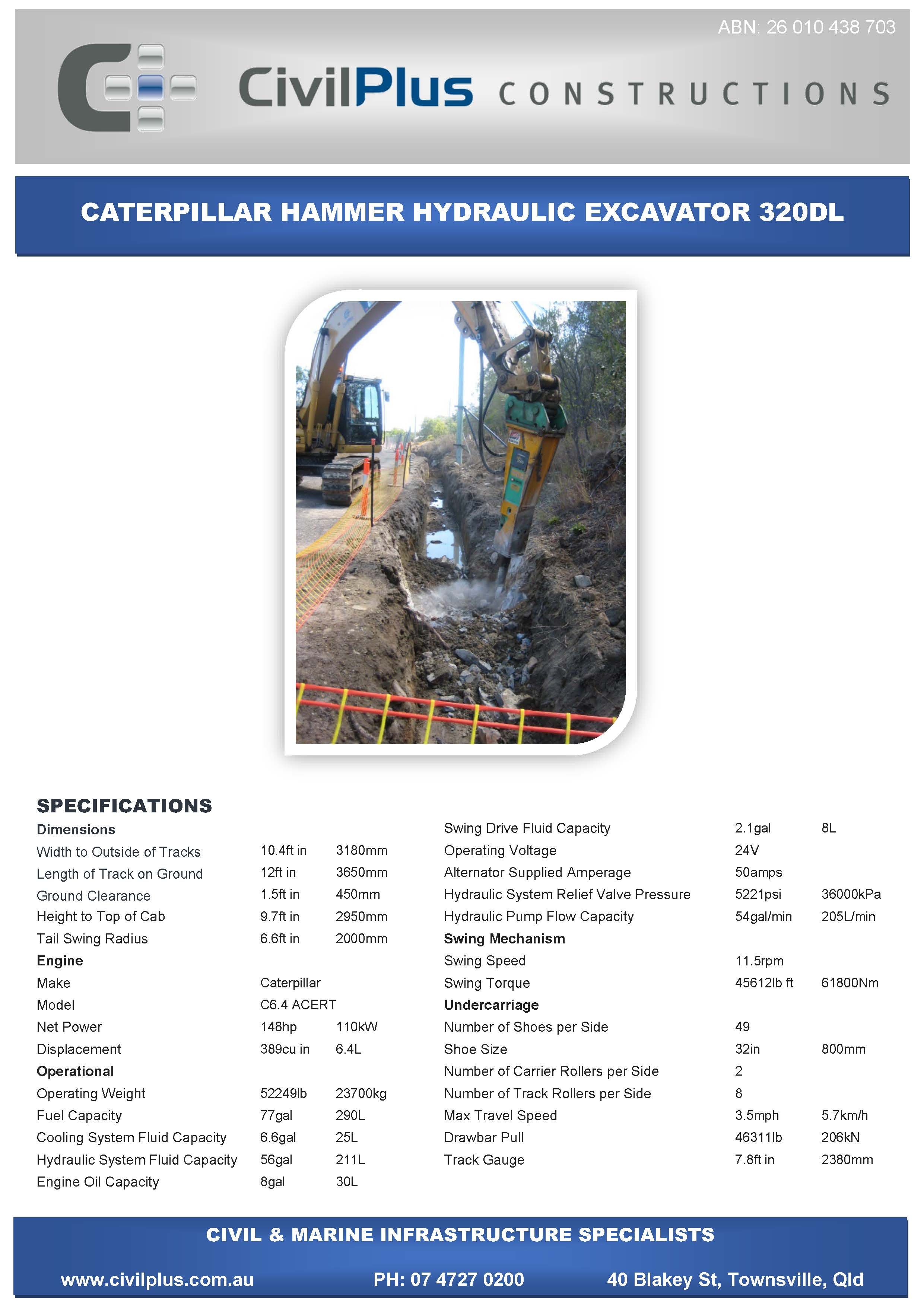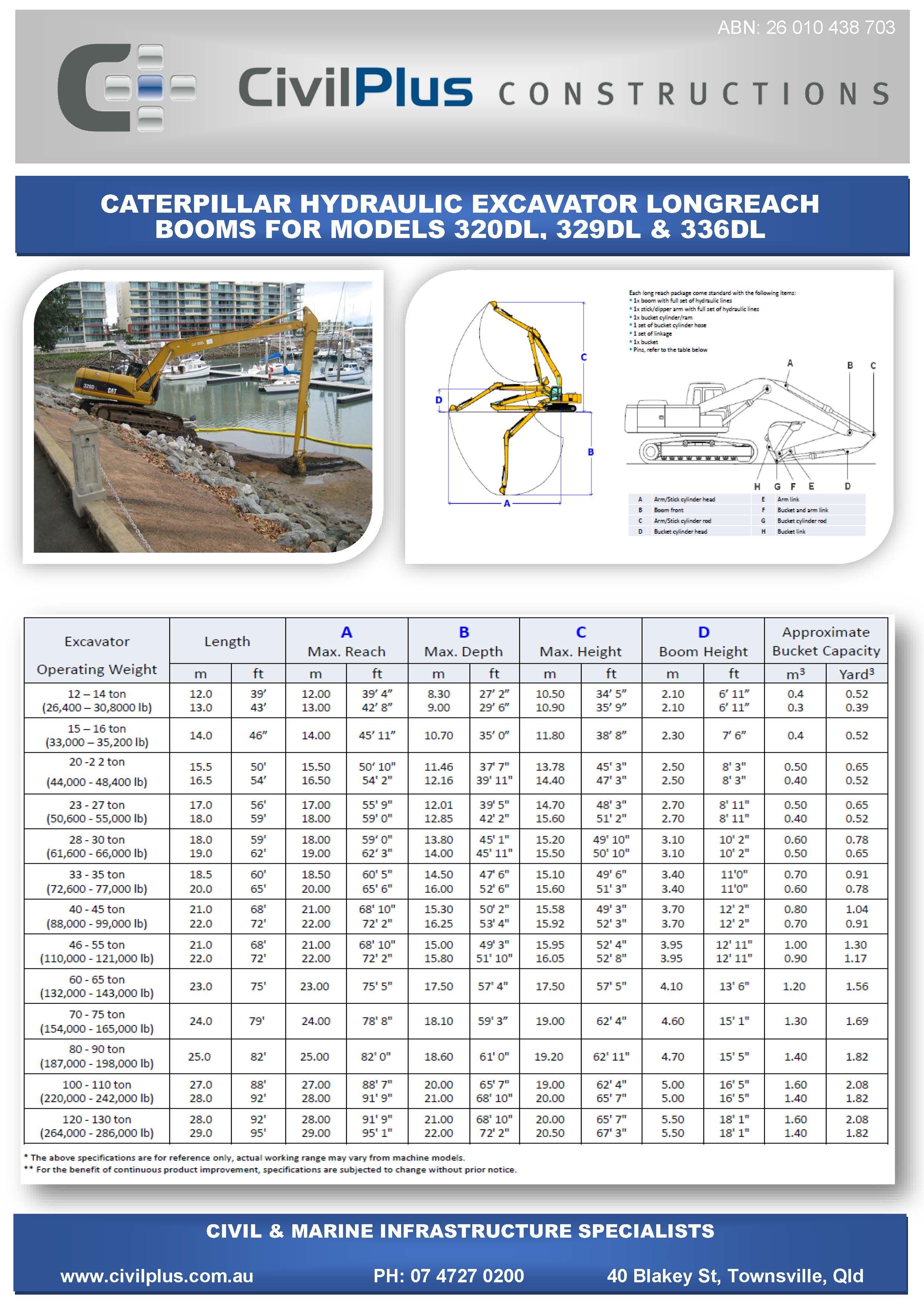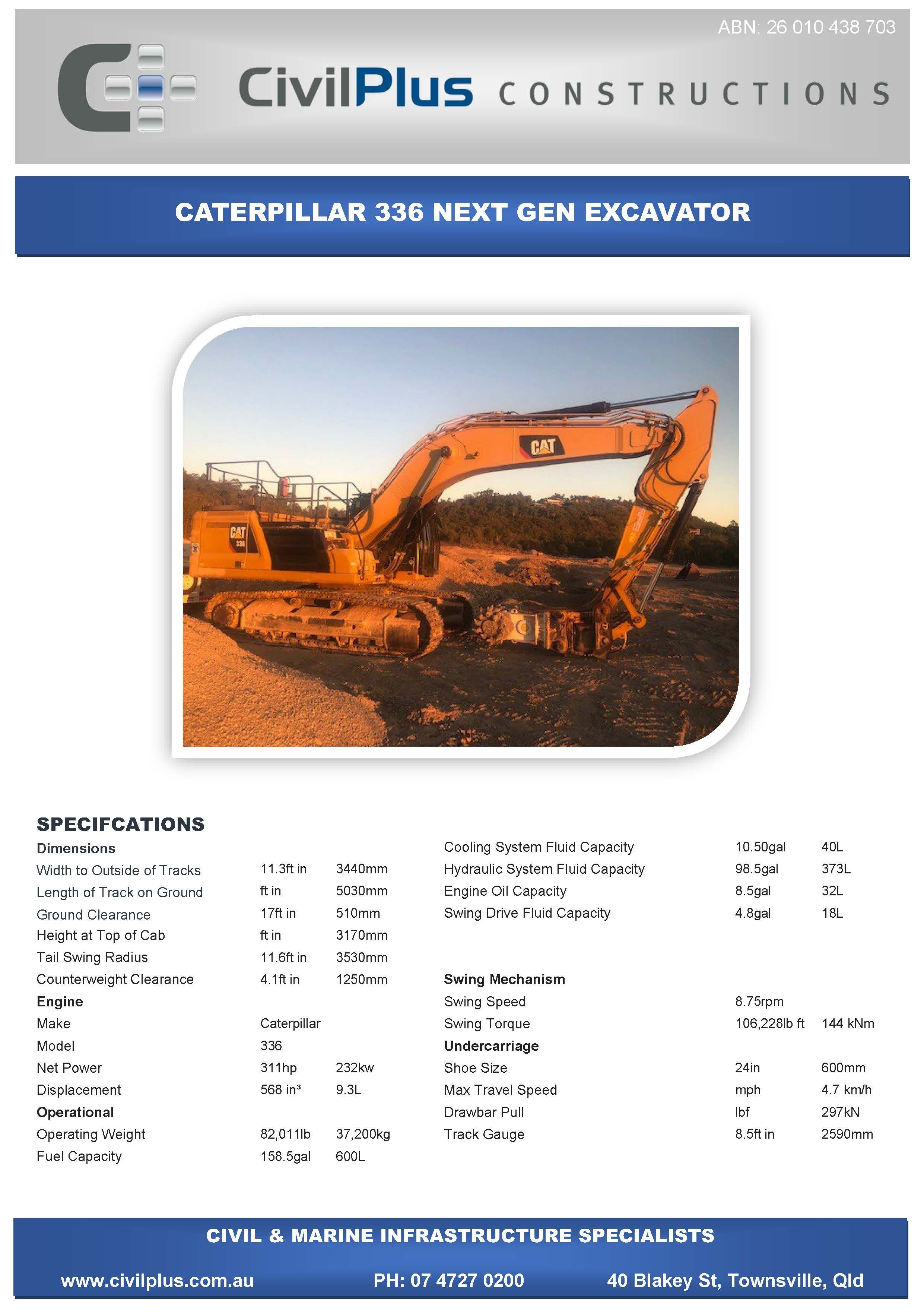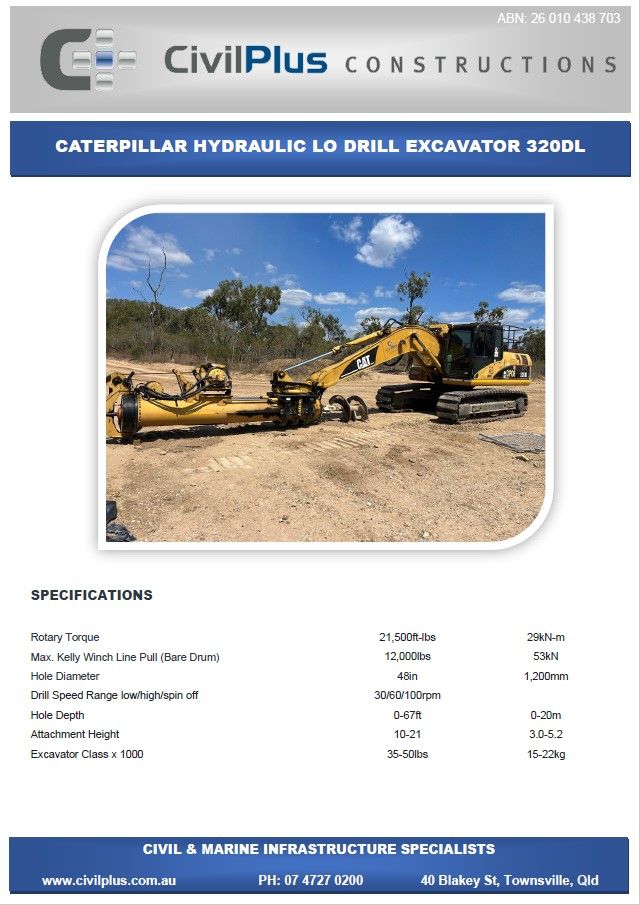 CivilPlus have an extensive list of modern plant and attachments for all types of civil and marine constructions. All excavators and backhoes are hydraulic burst protected and have rated SWL to comply with WHS Legislation. All plant and equipment is meticulously maintained and can be supplied with its full service and repair history which will provide peace of mind when it comes to reliable plant that meets WHS & Environmental Legislation.